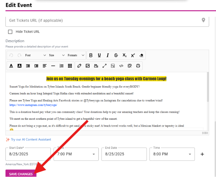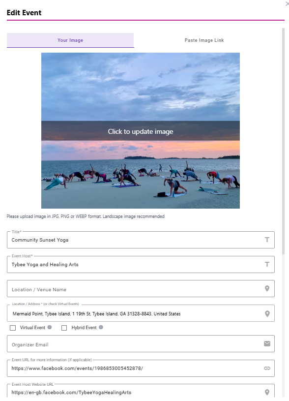Events populated in the ImGoing Dashboard are pulled directly from Facebook, Google or Eventbrite. The ImGoing Dashboard provides you complete editorial control of events shared on your event calendar. If your team notices that there is an event with incorrect information, it is possible to edit specific details of that particular event before approving, such as name, date, hour, location, image, and description.