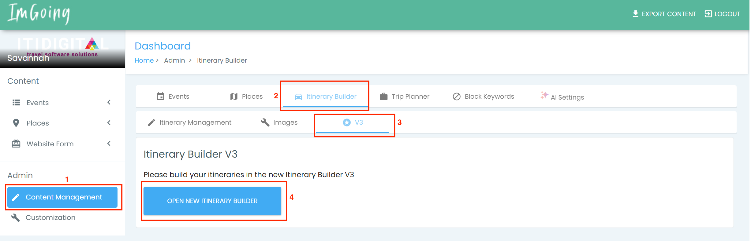 Open the Client Dashboard, then select Content Management → Itinerary Builder → V3 → Open New Itinerary Builder.
