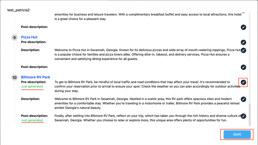 - After the generation is completed, a new window will display all the places from the list along with all their pre-, post- and main description. The texts that were just generated are marked as so. From here, you have the opportunity to edit any text, including the just generated ones by using the edit buttons, and/or to save it: