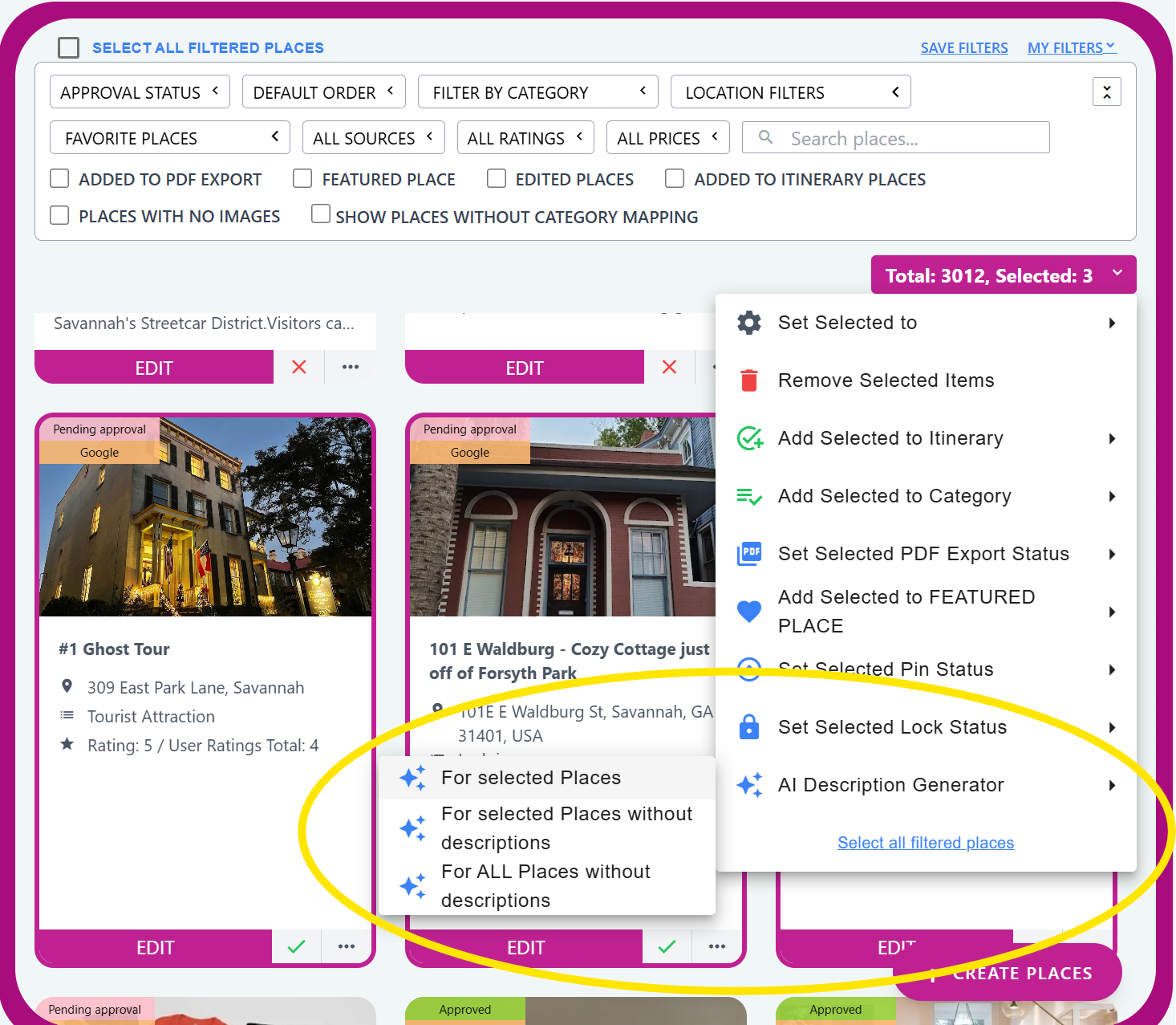 - For selected Places without descriptions: will generate descriptions for only the selected Place listings that DO NOT have a description saved.