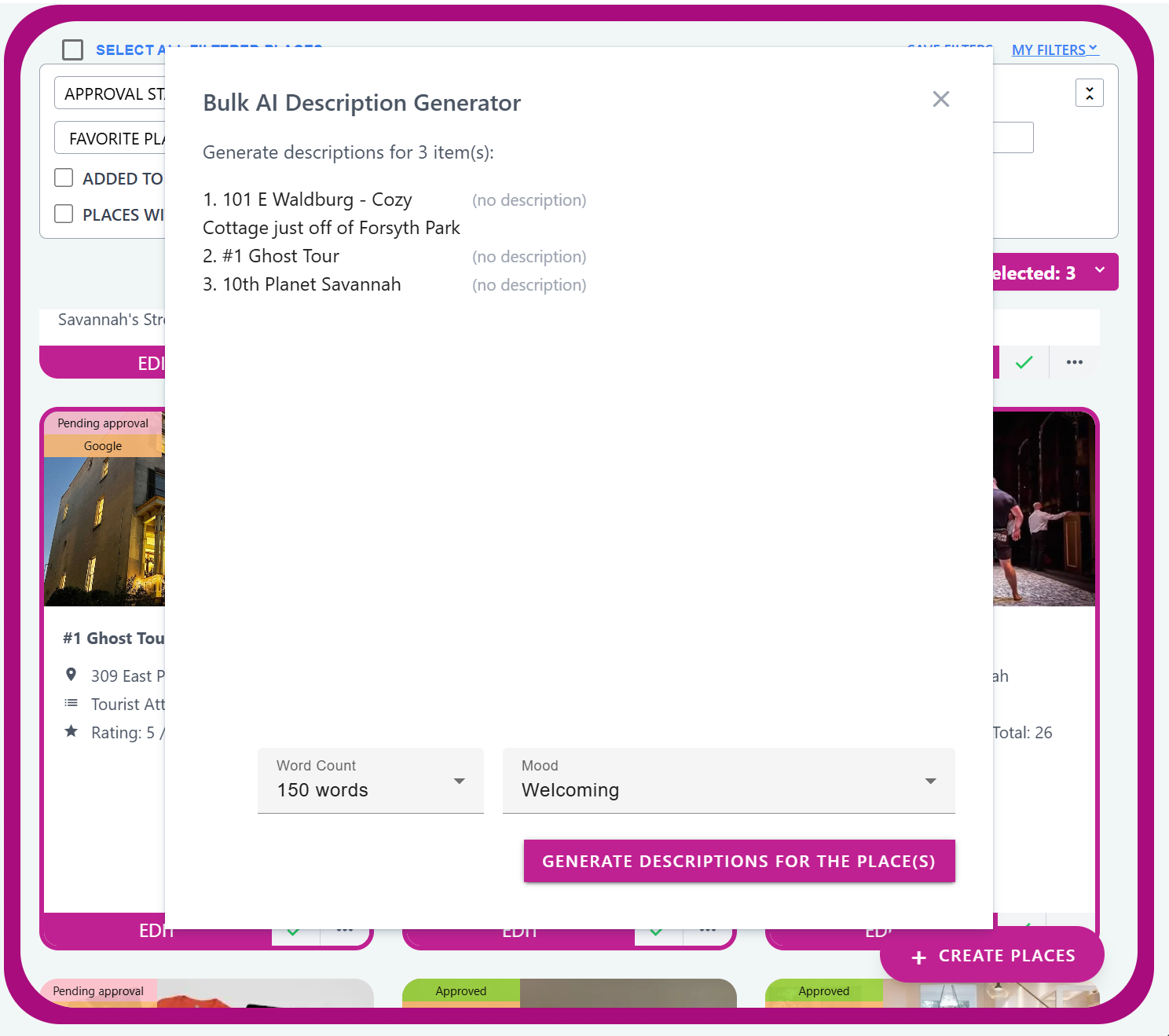- For ALL Places without descriptions: generate descriptions for all Place listings in the Dashboard that do not have a description.